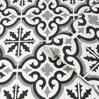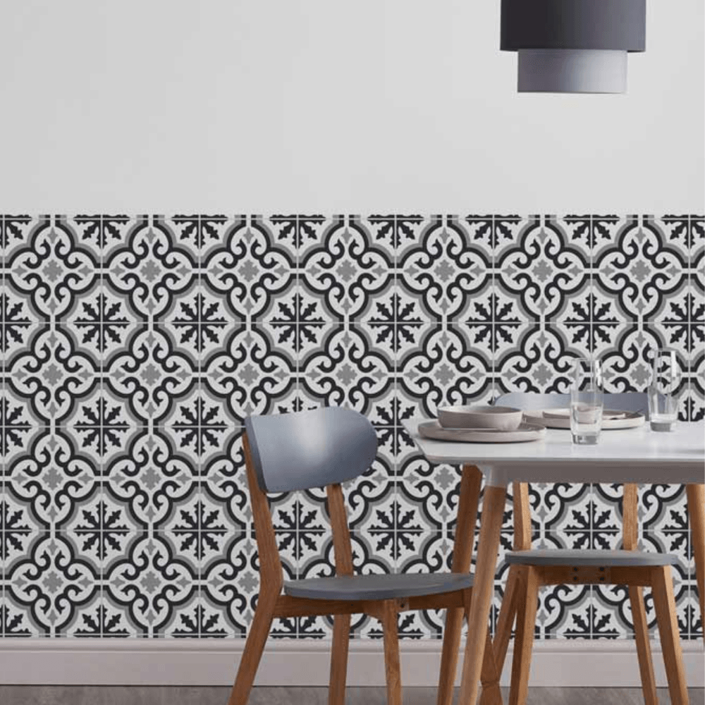 Küchentapete mit Vinyloberfläche mit hellgrauen und schwarzen Ornamenten, Fliesenimitat.