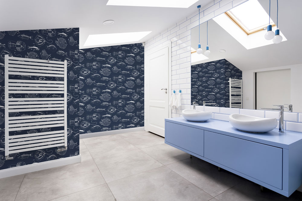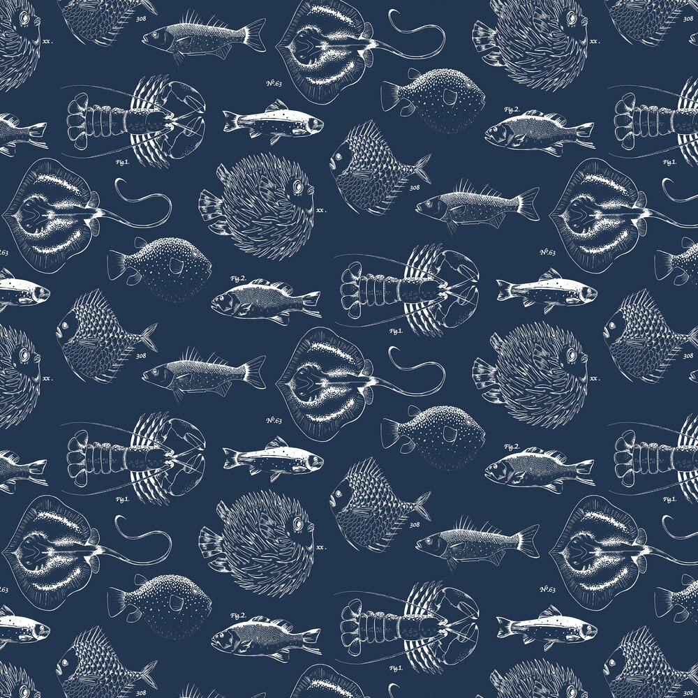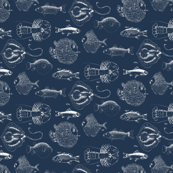 Vliestapete mit Vinyloberfläche in dunkelblauer Farbe und Motiven von Meerestieren.