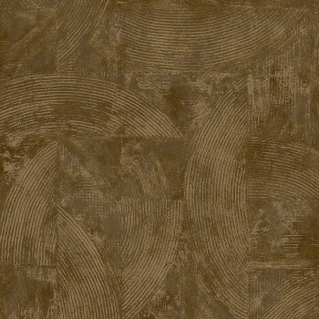 Braune Vliestapete mit markantem geometrischem Stuckmuster und goldenen Metallic-Reflexen.