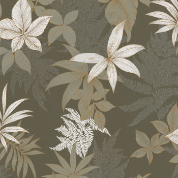 Olivgrüne Vliestapete mit silbernen Farnblättern und kupferfarbenen Blattkonturen.