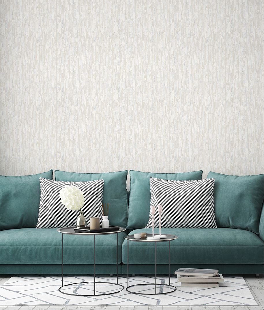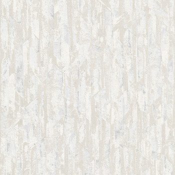 Grau-weiße Vliestapete mit metallischen Reflexen und einem markanten Muster.