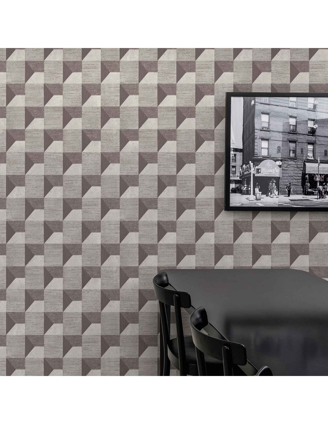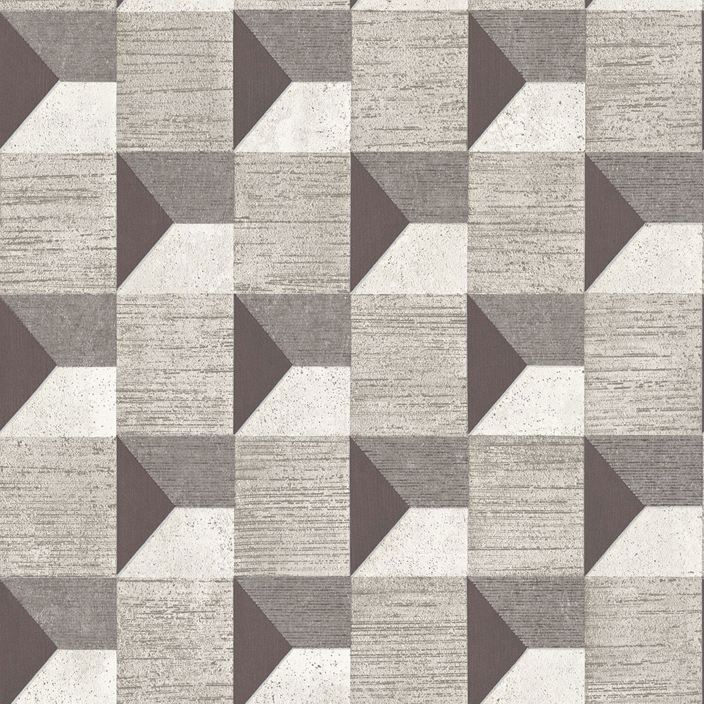Graue geometrische Vliestapete mit markantem Muster und 3D-Effekt.
