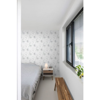 Grau-weiße Vliestapete mit Metallic-Reflexen und markantem Stuckmuster.