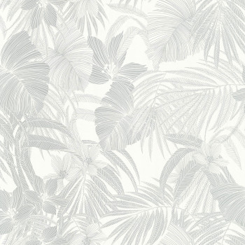 Weiße Vliestapete mit silbernen Palmblättern und zarten Hibiskusblüten-Konturen.