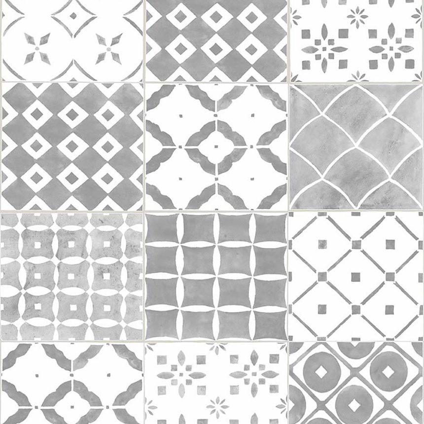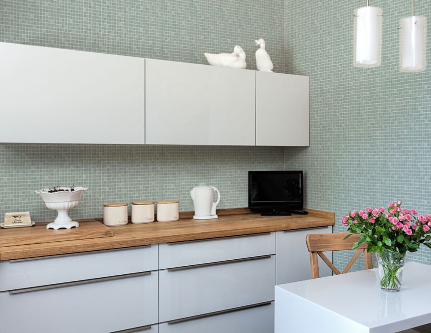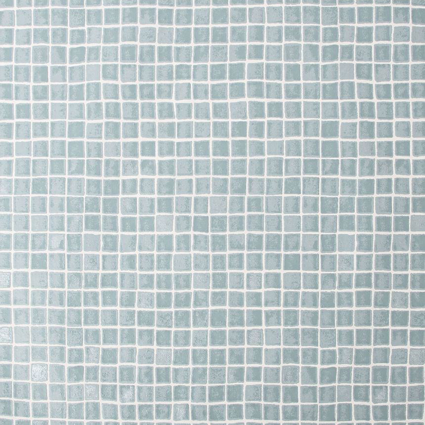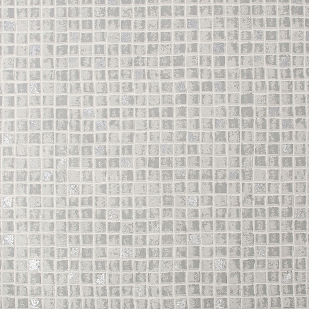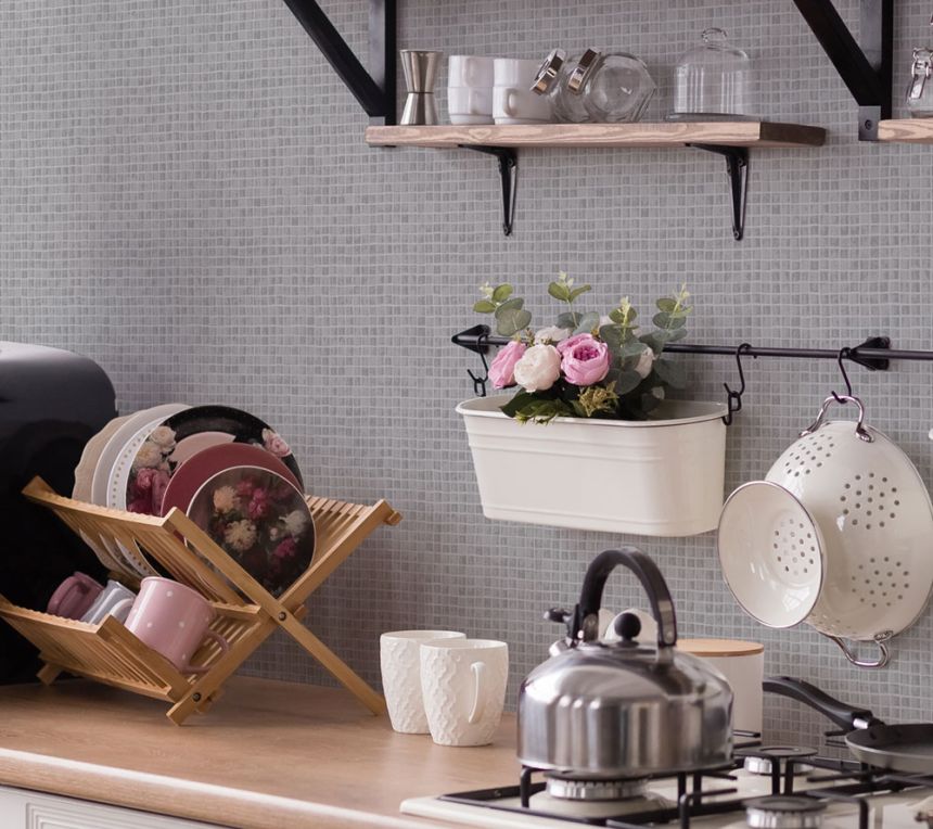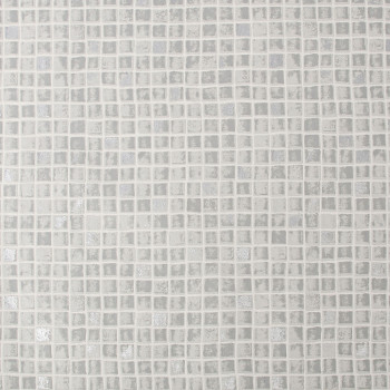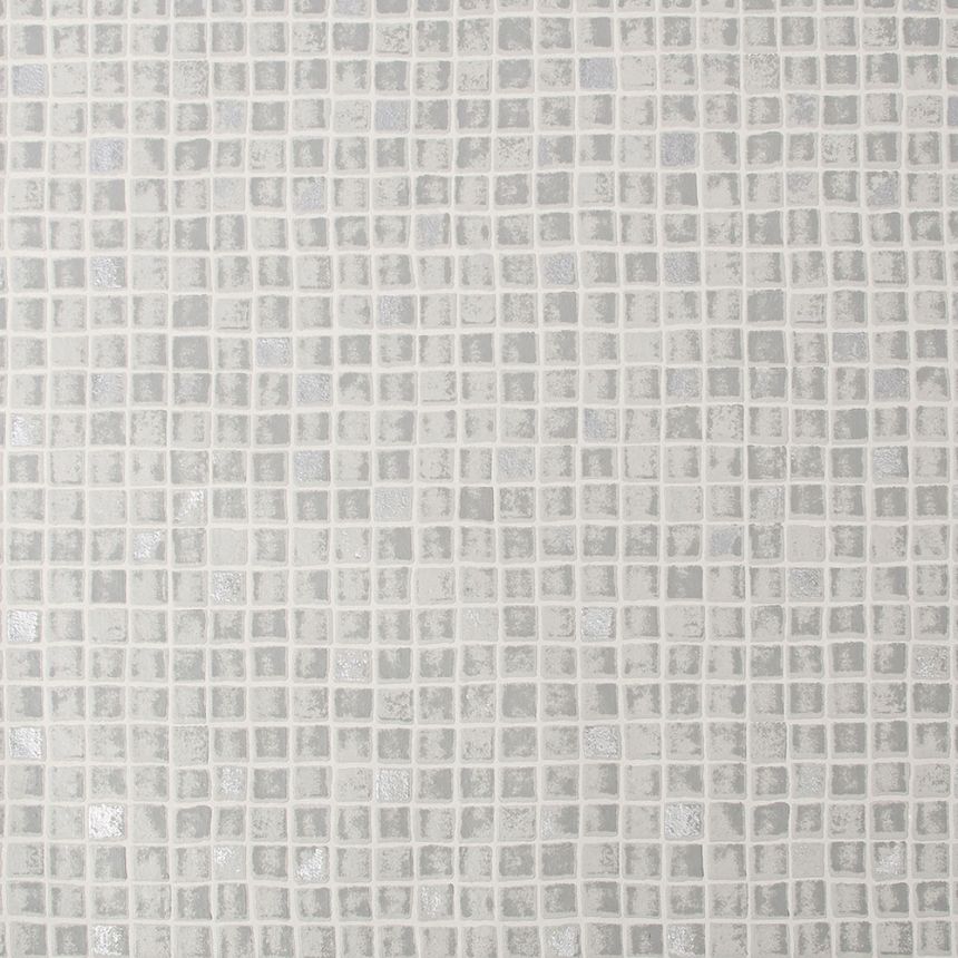 Badezimmer- und Küchentapete mit hellgrauer Vinyloberfläche, Imitation von Mosaikfliesen.