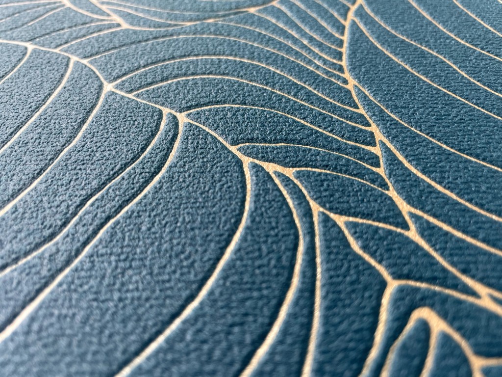 Grün-blaue Vliestapete mit einem markanten Muster und goldenen Blattkonturen.