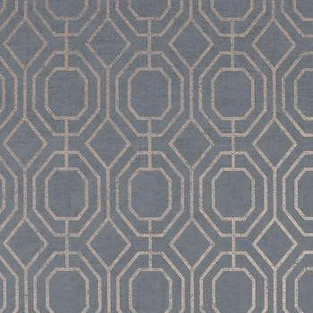 Blaugraue, grob strukturierte Tapete mit goldenen, geometrischen Ornamenten.