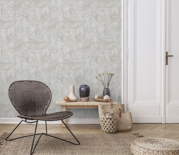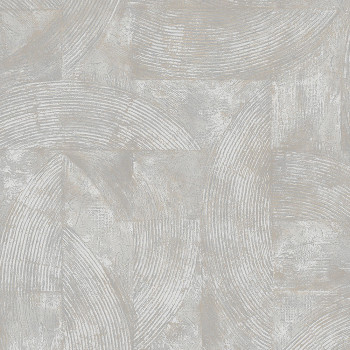 Graue Vliestapete mit markantem geometrischem Stuckmuster und metallischen Reflexen.