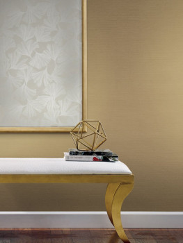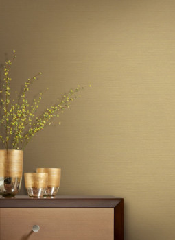 Goldmetallische Vliestapete, Imitation gröberer Stoffe.