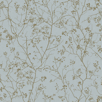 Hellblaue Vliestapete, goldene Metallic-Zweige. Tapete geeignet für Wohnzimmer oder Schlafzimmer.