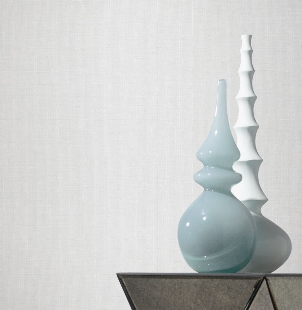 Weiße Wolltapete mit Perlglanz, Imitation von gröberem Stoff, abwaschbare Oberfläche.