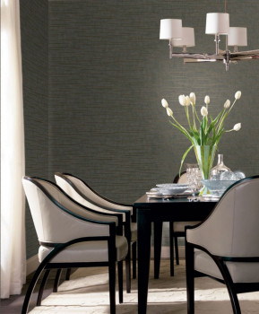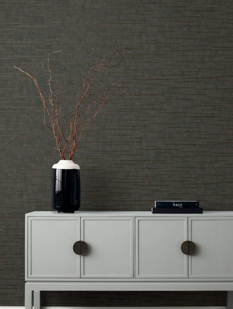 Dunkelgrau-braune Wolltapete, metallisch glänzende Metallstreifen.