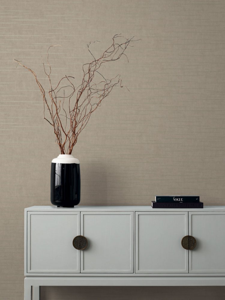 Braun-graue Vliestapete, metallisch glänzende, goldfarbene Querstreifen.
