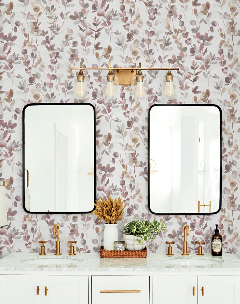 Glatte Vliestapete, Eukalyptusblätter und -zweige in Braun- und Lila-Tönen.