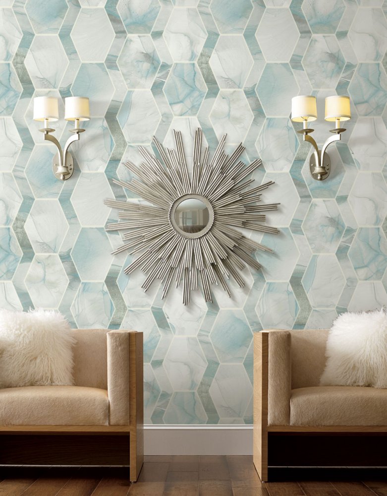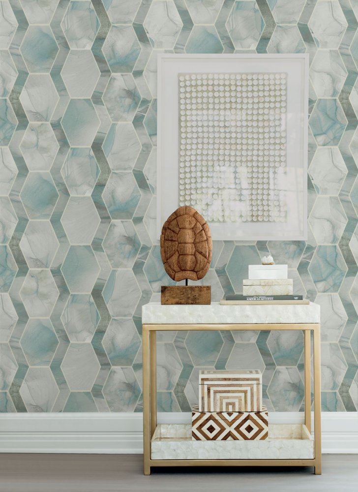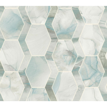 Glatte Vliestapete, Imitation von Marmorfliesen in Grün- und Türkistönen.