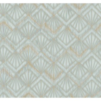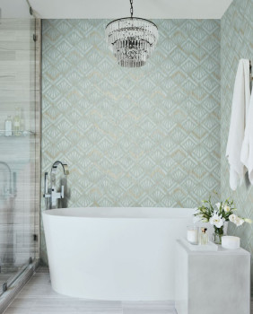 Türkisfarbene Vliestapete, stilisierte Muscheln metallischem Glanz.