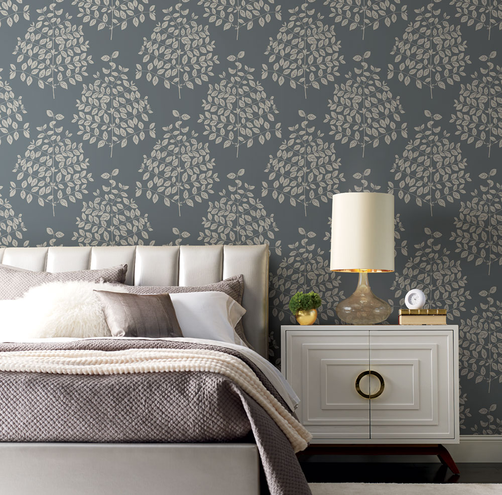 Dunkelgraue Vliestapete, beiges Muster aus Zweigen und Blättern.