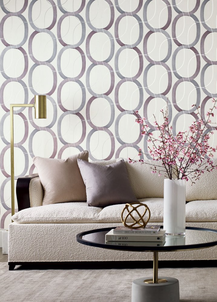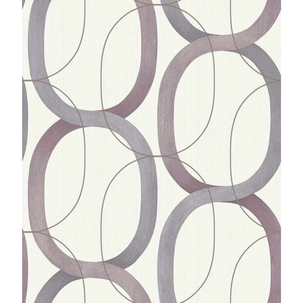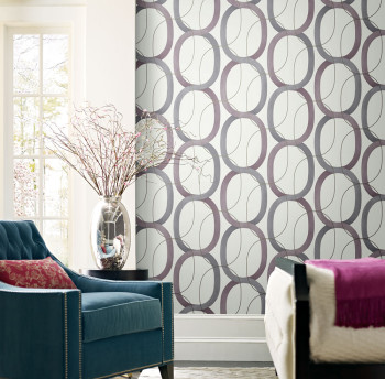 Glatte Vliestapete, geometrische Muster - Ovale - in Pflaumen- und Silbertönen.