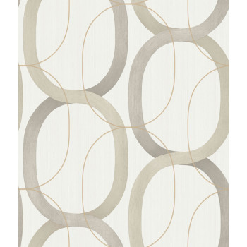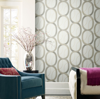 Glatte Vliestapete, geometrische Muster - Ovale - in Grau-, Beige- und Goldtönen.