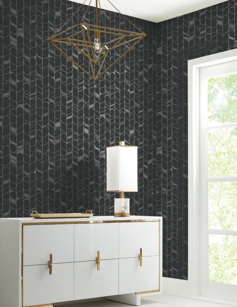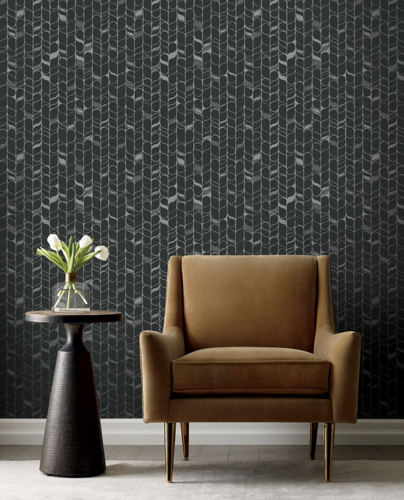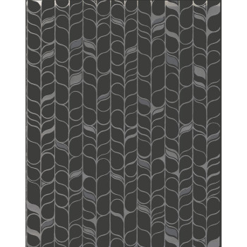 Schwarze Vliestapete, silberne Umrisse von stilisierten Blättern, graue Details.