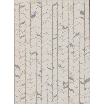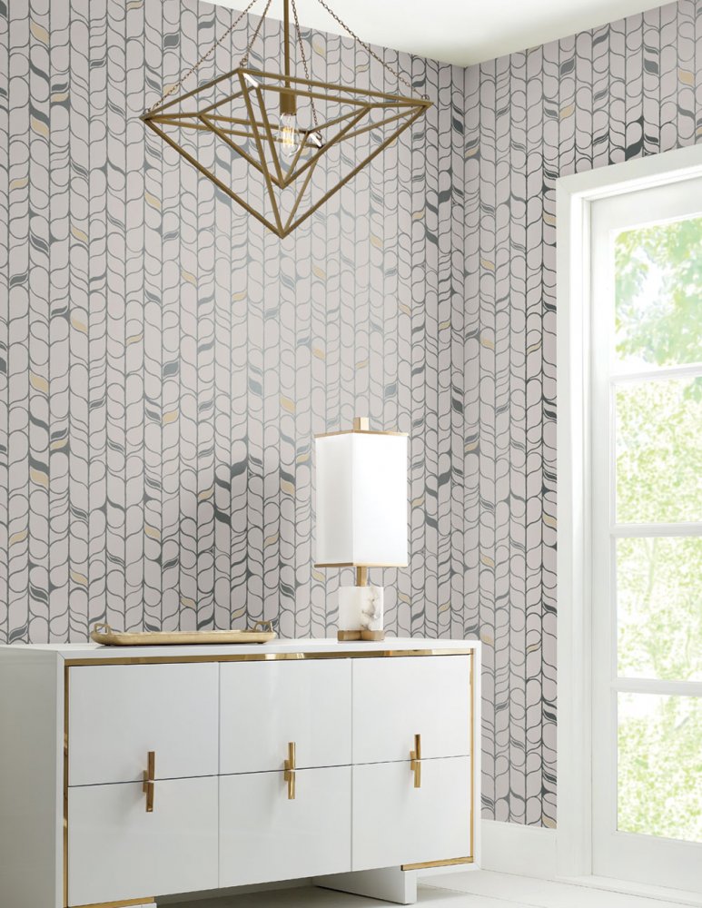 Graue Vliestapete, silberne Umrisse stilisierter Blätter, beige Details.