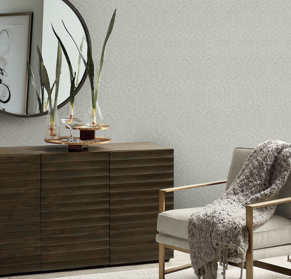 • Die Damask-Kollektion von vorgeklebten Tapeten und Papiertapeten ist voller luxuriöser ornamentaler Designs, die von Naturmotiven inspiriert sind.