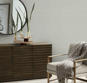 Grau-weiße vorgeklebte Barocktapete DM5036, Damask, York