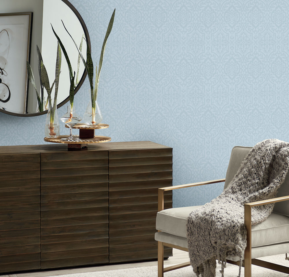 Hellblaue, vorgeklebte Tapete mit Ornamenten DM5033, Damask, York