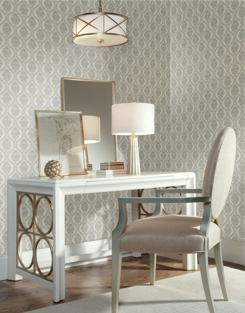 Weiße vorgeklebte Tapete, graues Barockdamastmuster.