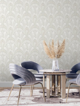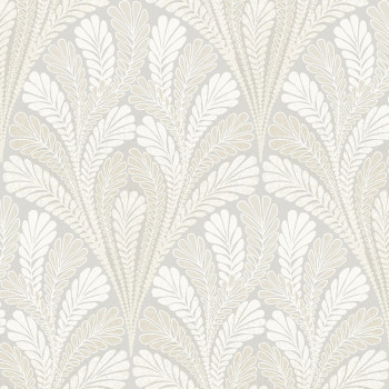 Graue, glatte, vorgeklebte Tapete - grau-beige und weiße stilisierte Blätter bilden ein ornamentales Muster.