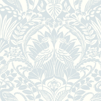 Blau-weiße, glatte, vorgeklebte Tapete, Blätter, Vögel, ornamentales Barockmuster.