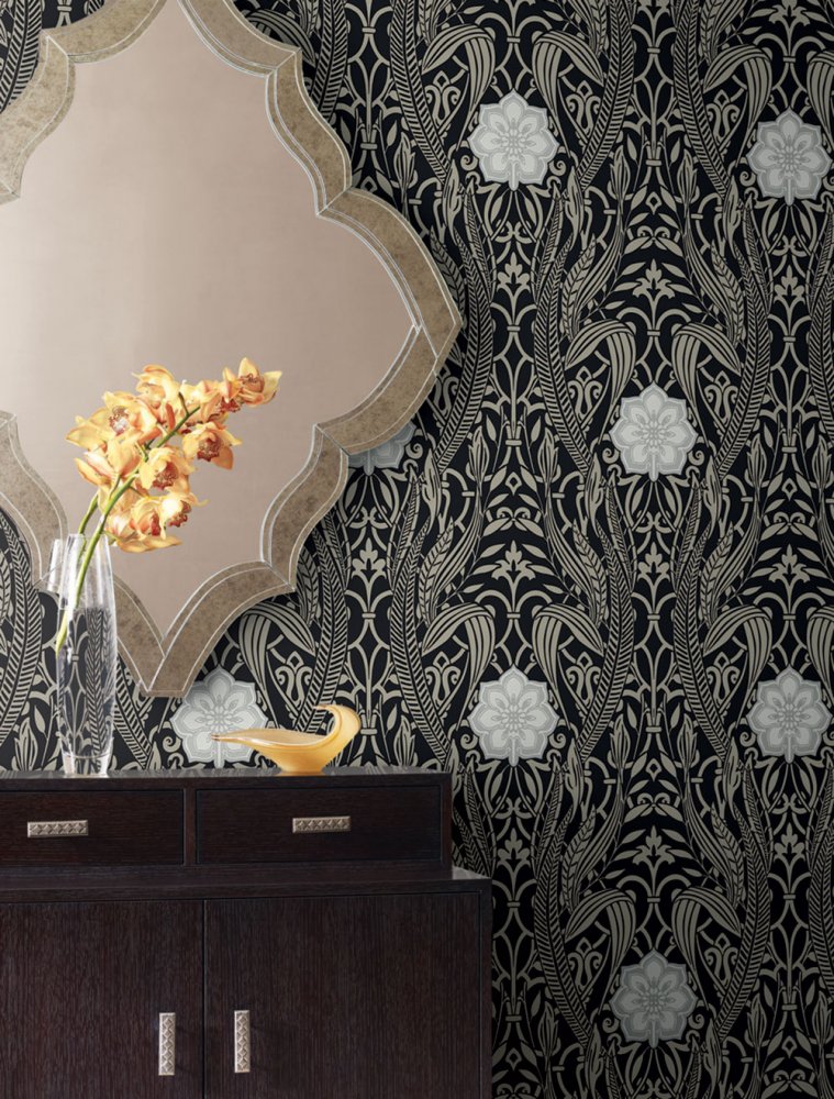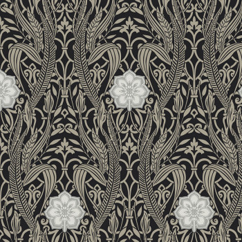 Schwarze, glatte, vorgeklebte Tapete, grau-beiges Ornamentmuster mit Blättern und weiß-silbernen Blüten.