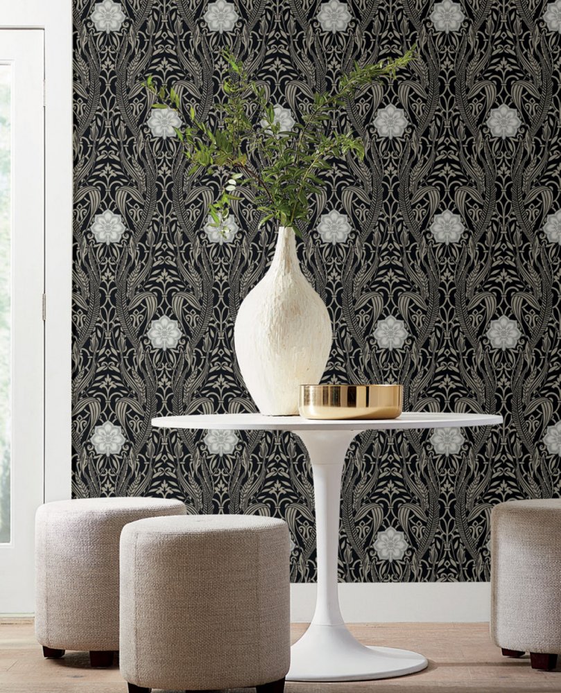 Schwarze vorgeklebte Tapete -Ornamenten DM4995, Damask, York
