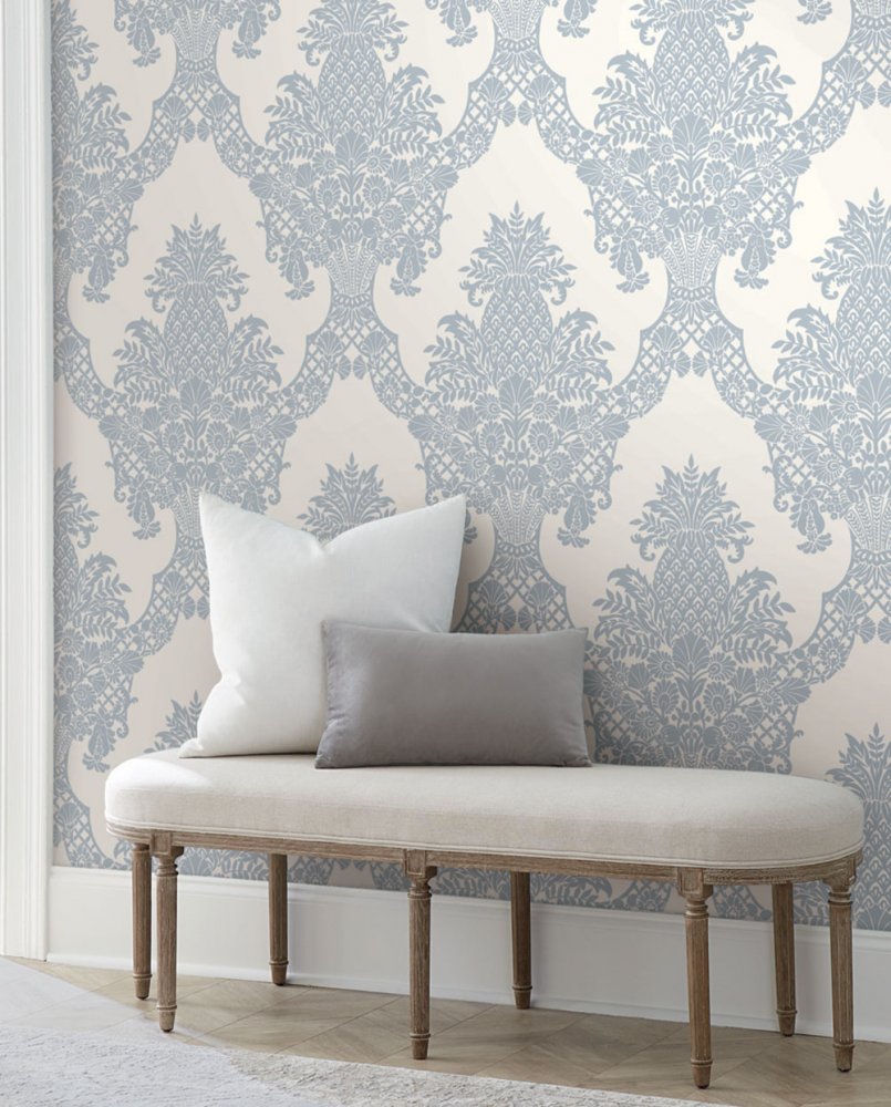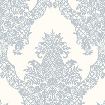 Weiße, glatte, vorgeklebte Tapete, blaues, florales, ornamentales Barockmuster, Ananas.