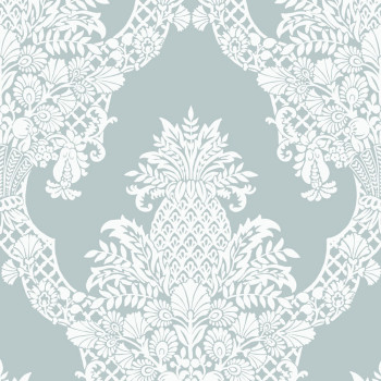 Türkisfarbene glatte, vorgeklebte Tapete, blaues florales Barockmuster, Ananas.