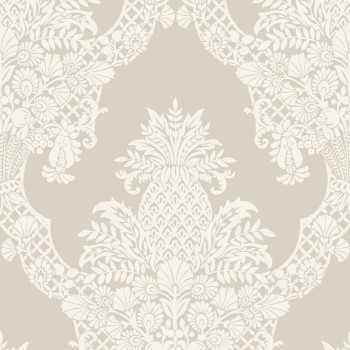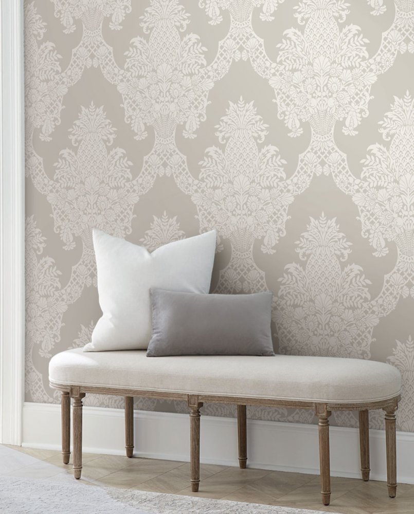 Grau-beige, glatte, vorgeklebte Tapete, weißes, florales Barockmuster, Ananas.