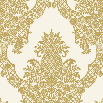 Cremefarbene, glatte, vorgeklebte Tapete, braun-goldenes, florales Barockmuster, Ananas.