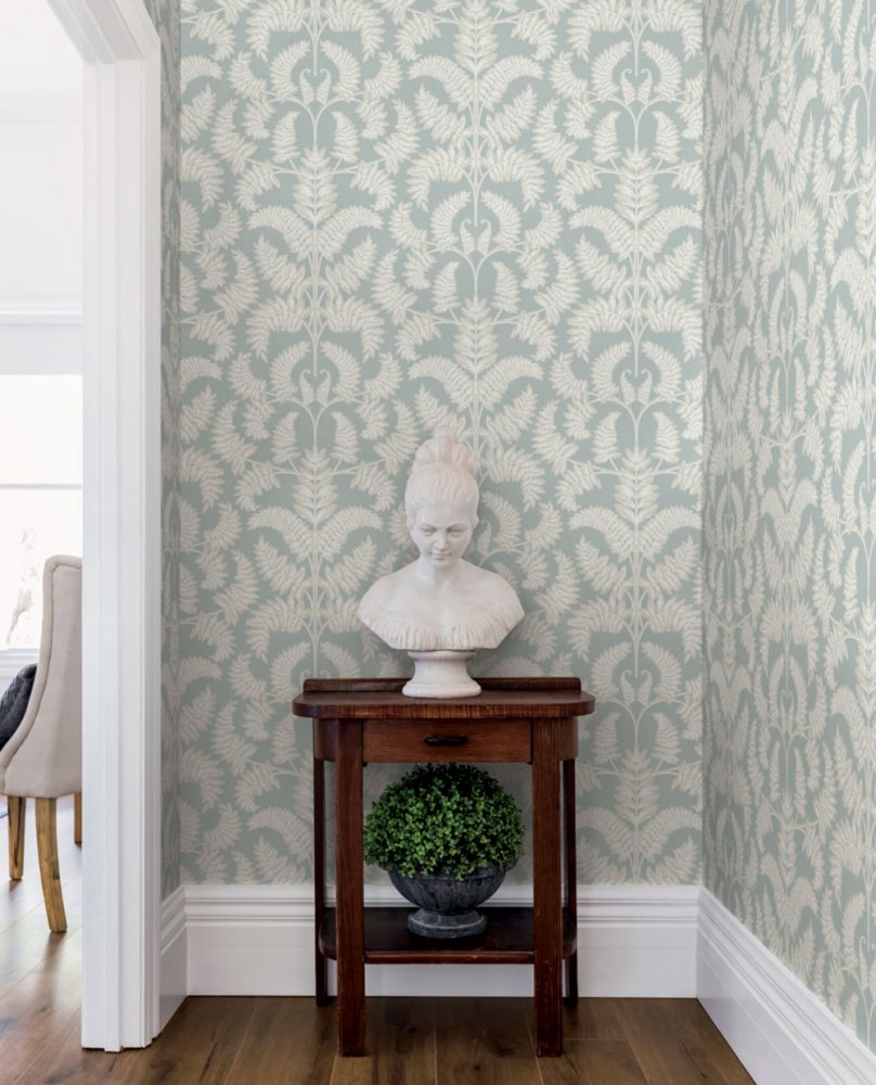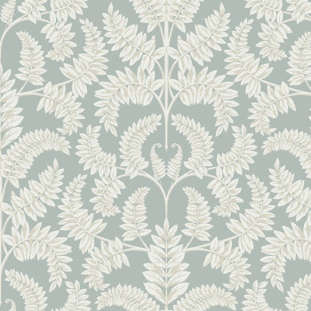 Grüne, glatte, vorgeklebte Tapete, weiße und beige stilisierte Blätter bilden ornamentale Muster.