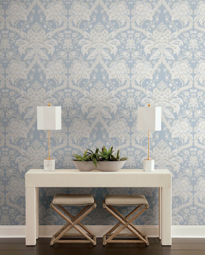 Blau-weiß-beige glatte, vorgeklebte Tapete, graue Details, ornamentales barockes Damastmuster.