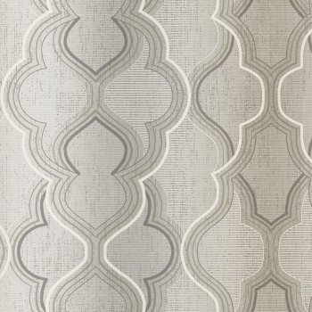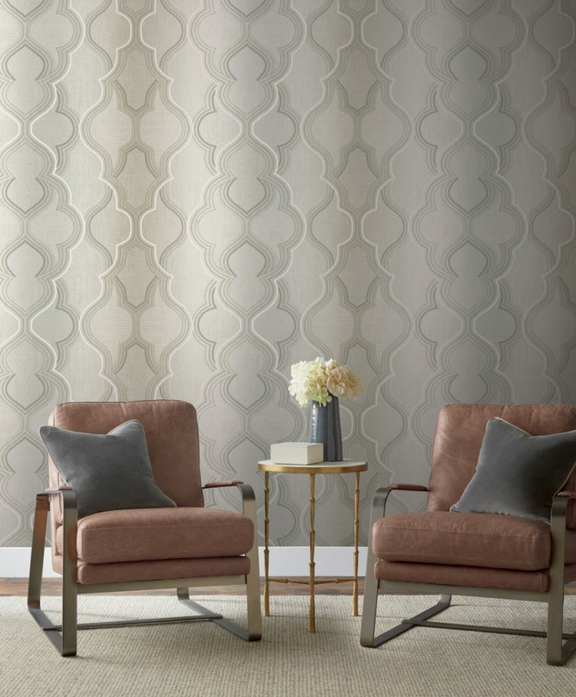 Beigefarbene, vorgeklebte Tapete, braune und silberne Linien, schattiertes Ombré-Ornamentmuster.