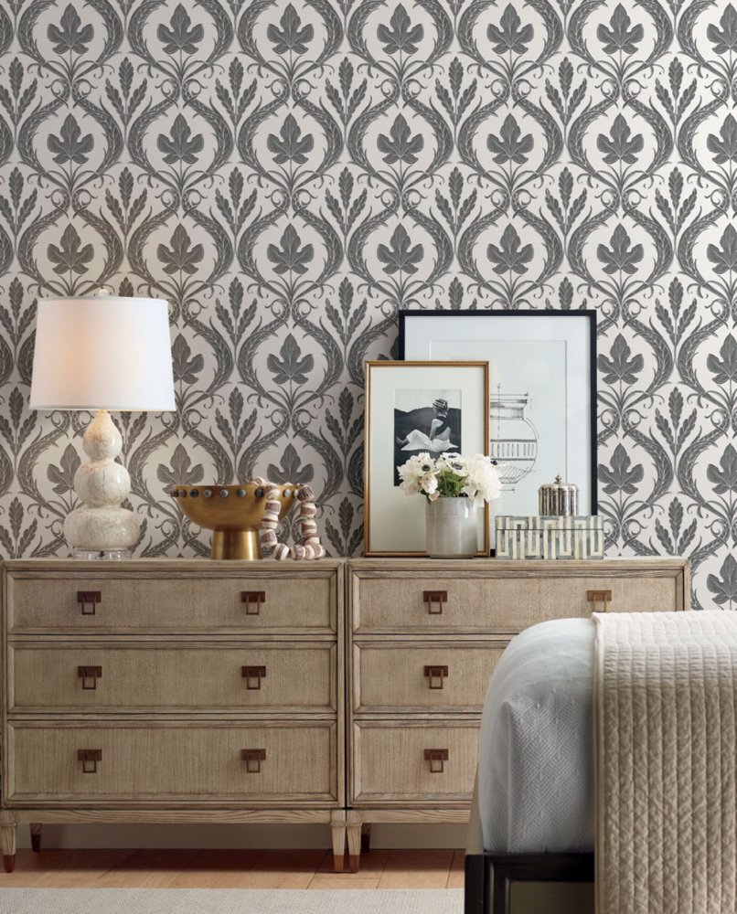 • Die Damask-Kollektion von vorgeklebten Tapeten und Papiertapeten ist voller luxuriöser ornamentaler Designs, die von Naturmotiven inspiriert sind.