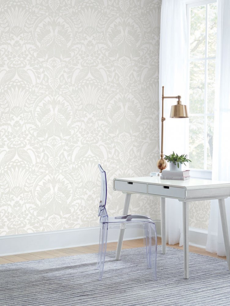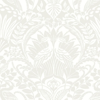 Grauweiße vorgeklebte Tapete, Ornamente, Vögel BW3932, Damask, York