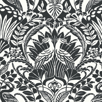 Schwarz-weiße, glatte, vorgeklebte Tapete, Blätter, Vögel, ornamentales Barockmuster.