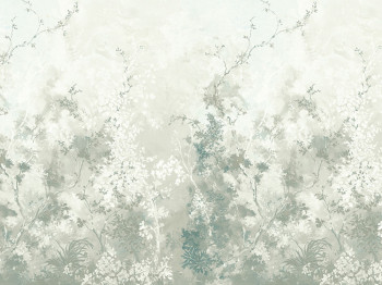 5-teilige Fototapete mit dem Motiv von abstrakten Ästen im Nebel in Grüntönen.