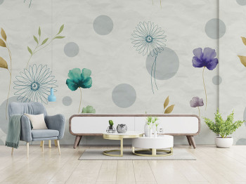 5-teilige Fototapete mit einem Blumenmotiv in Beige- und Grautönen.