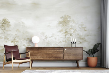 5-teilige Fototapete mit dem Motiv von abstrakten Bäumen im Nebel in Beigetönen.