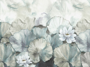 5-teilige Fototapete mit einem Motiv aus Blumen mit Blättern in Blau- und Lilatönen.