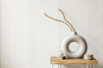 Vliestapete mit Vinyloberfläche in Beigetönen mit floralem Muster und dezenten Streifen.