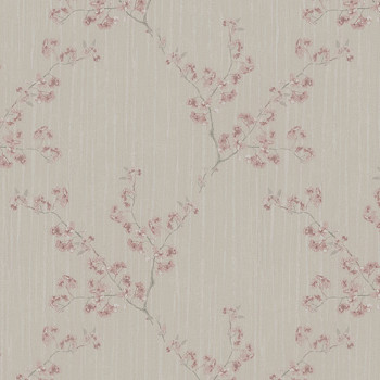 Vliestapete mit Vinyloberfläche mit einem Muster und einer Struktur aus feinen Streifen mit Blumen in Rosa- und Beigetönen.