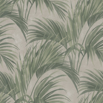 Vliestapete mit Vinyloberfläche mit einem Blattmuster in Grün- und Beigetönen.